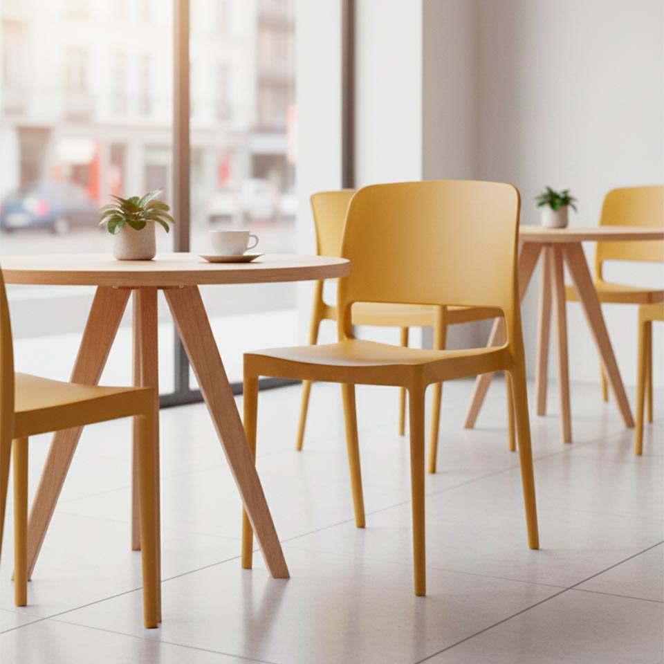 Otimização de Espaço: O seu design inteligente permite o empilhamento seguro, tornando-a a solução ideal para apartamentos compactos ou espaços comerciais (cafés e restaurantes) que necessitam de flexibilidade.