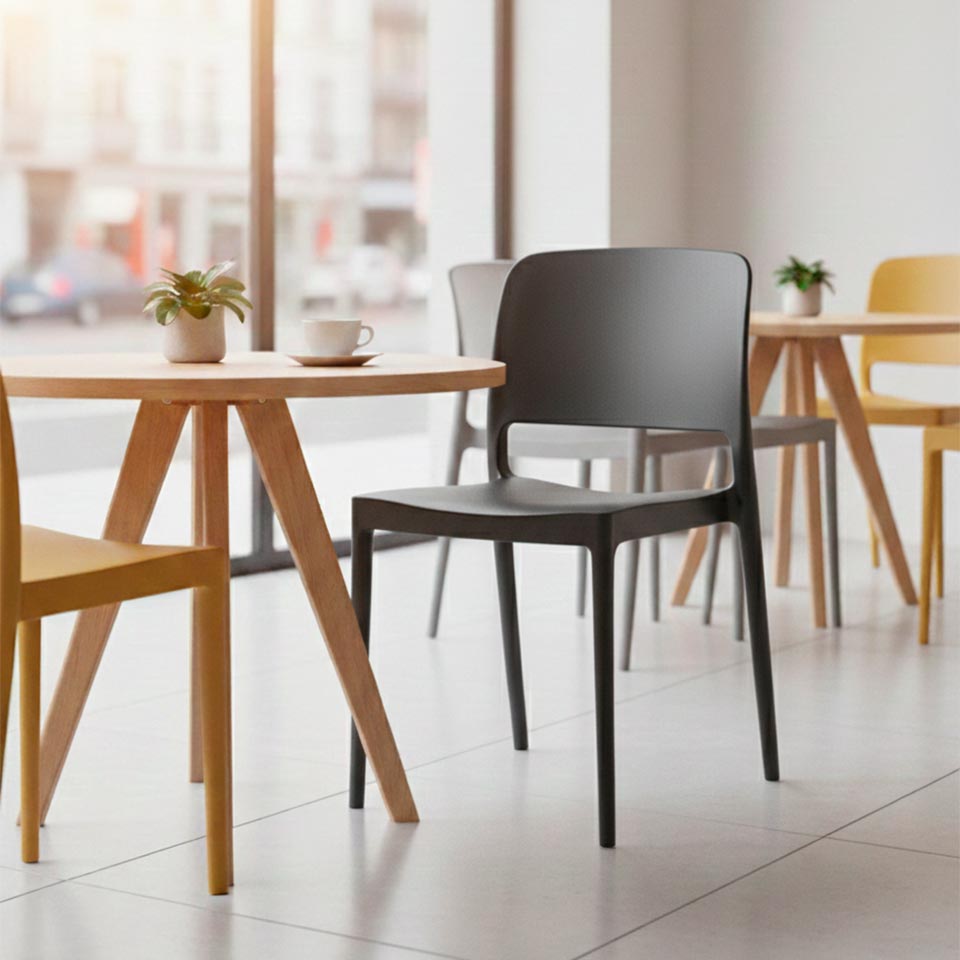 Otimização de Espaço: O seu design inteligente permite o empilhamento seguro, tornando-a a solução ideal para apartamentos compactos ou espaços comerciais (cafés e restaurantes) que necessitam de flexibilidade.