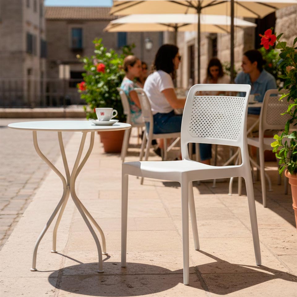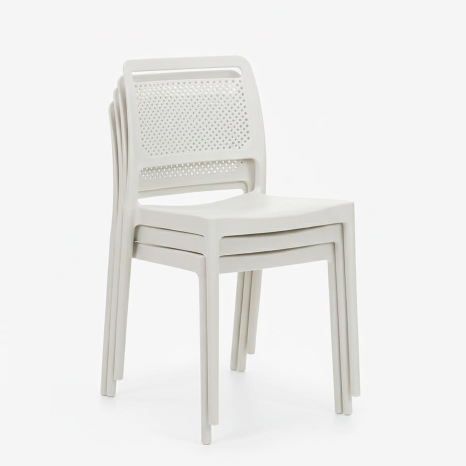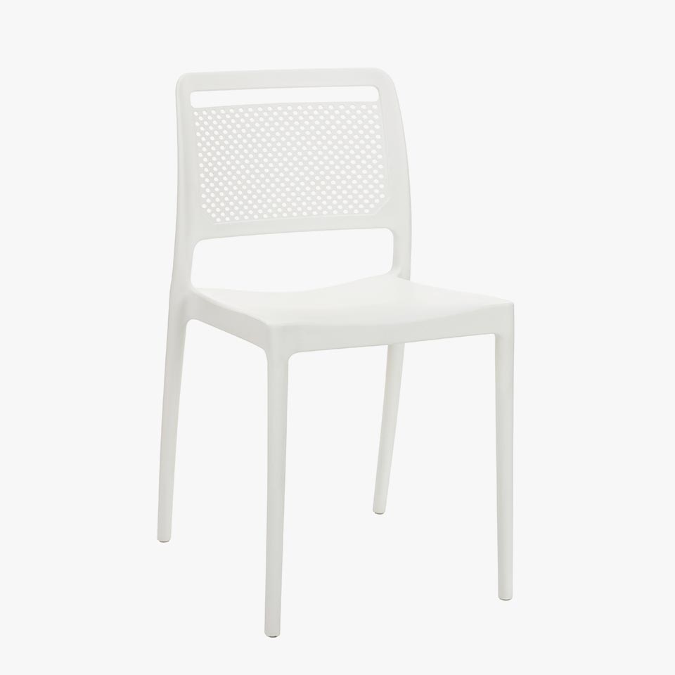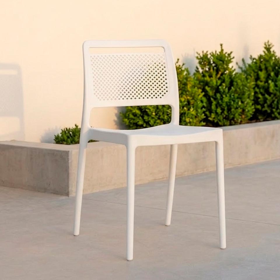 Com linhas simples e modernas, esta cadeira adapta-se facilmente a diferentes ambientes — desde salas de jantar e cozinhas até varandas, terraços ou zonas de refeição outdoor. O encosto perfurado não só acrescenta um toque visual atual, como também promove maior ventilação e conforto durante a utilização.