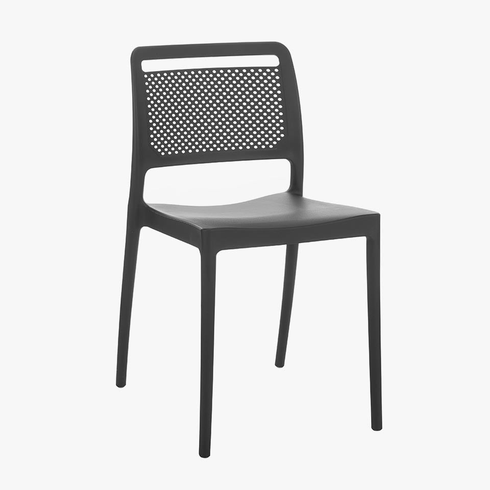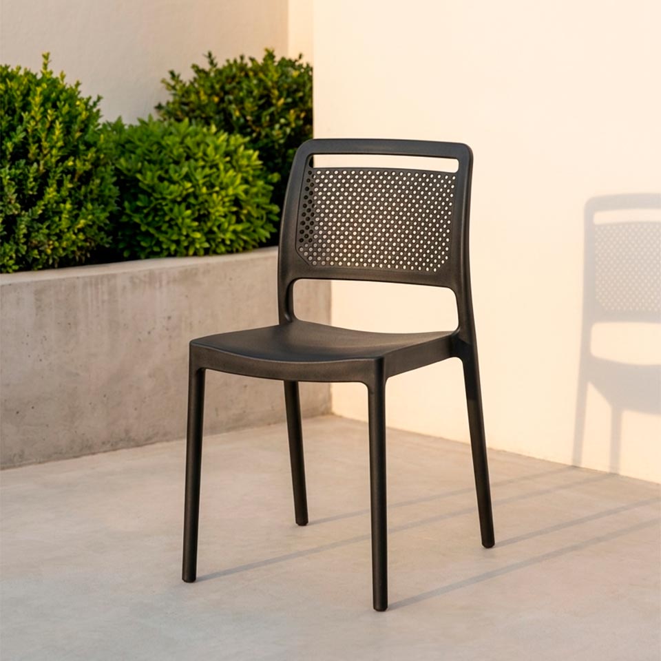 Com linhas simples e modernas, esta cadeira adapta-se facilmente a diferentes ambientes — desde salas de jantar e cozinhas até varandas, terraços ou zonas de refeição outdoor. O encosto perfurado não só acrescenta um toque visual atual, como também promove maior ventilação e conforto durante a utilização.