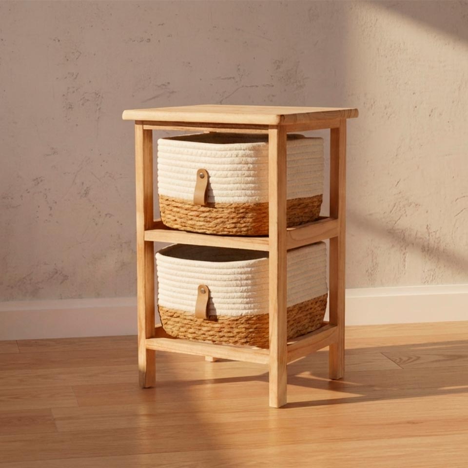 Eleve o estilo da sua casa com a sofisticação natural da Coleção Natura Breeze. Este móvel organizador combina a robustez sustentável da madeira de Paulownia com a delicadeza artesanal de cestos em corda de algodão e ervas marinhas. Perfeito para quem procura uma solução de arrumação leve, versátil e com uma estética clean, este conjunto adapta-se harmoniosamente a qualquer ambiente, desde uma casa de banho serena até um quarto de criança acolhedor.