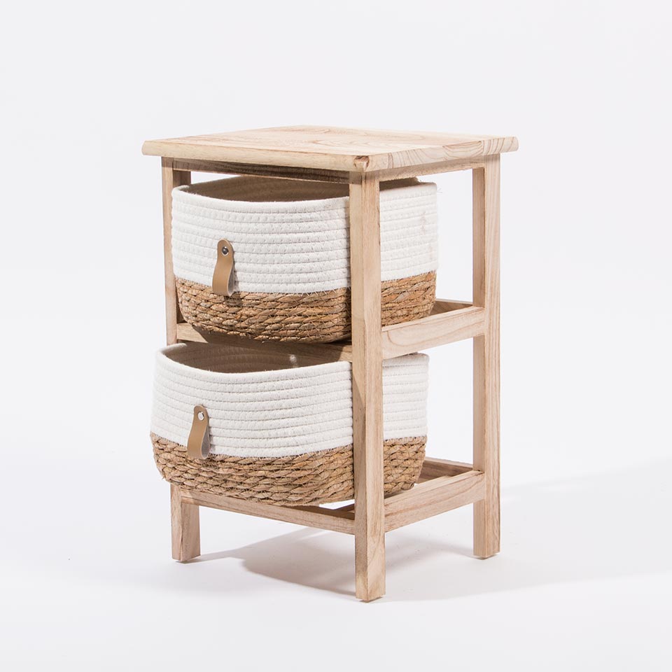 A estrutura é fabricada em madeira de Paulownia, conhecida como o "alumínio da madeira" pela sua incrível leveza e resistência, apresentando um acabamento natural que destaca os veios da madeira. Acompanha dois cestos bicolores, meticulosamente tecidos em corda de algodão (off-white) e ervas marinhas (seagrass), criando um contraste de texturas que é tendência absoluta no design de interiores.