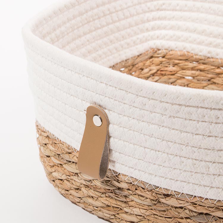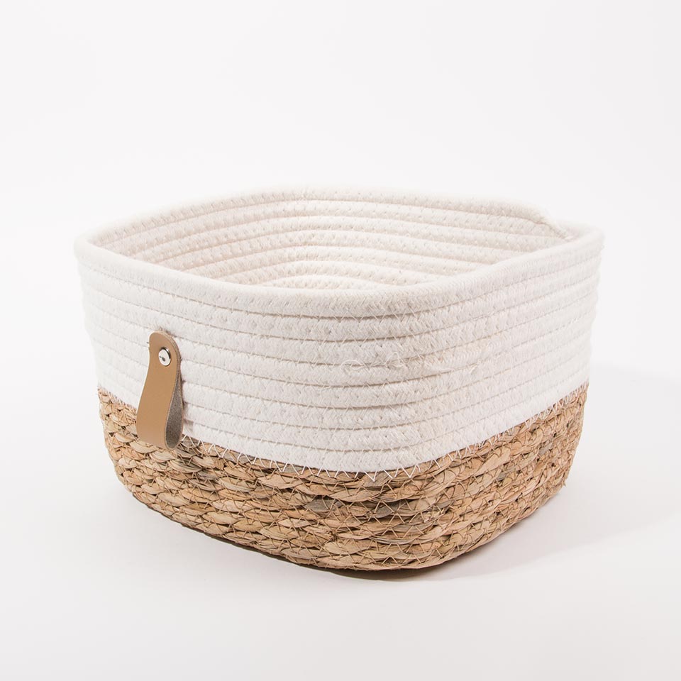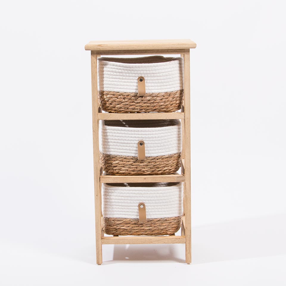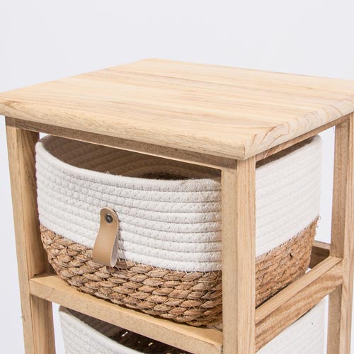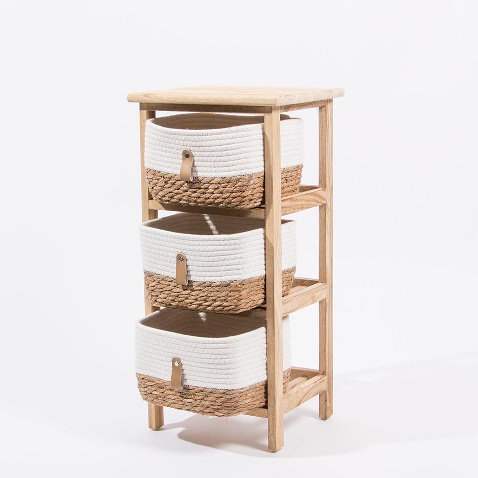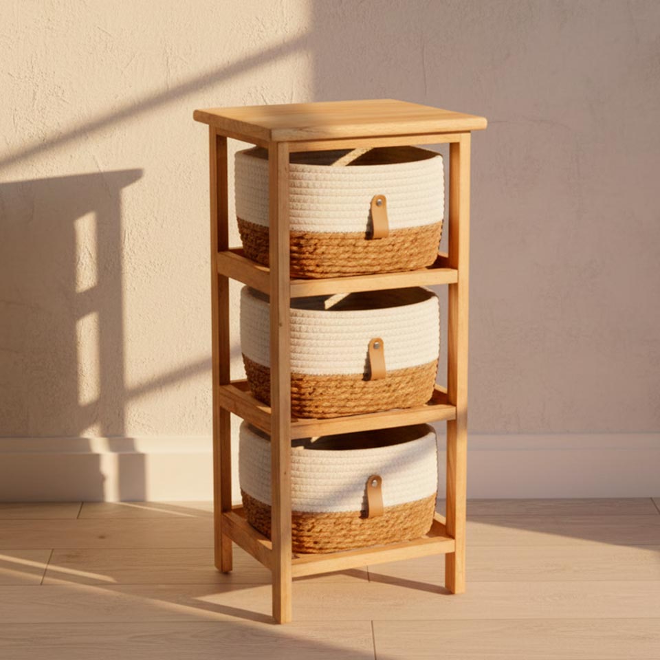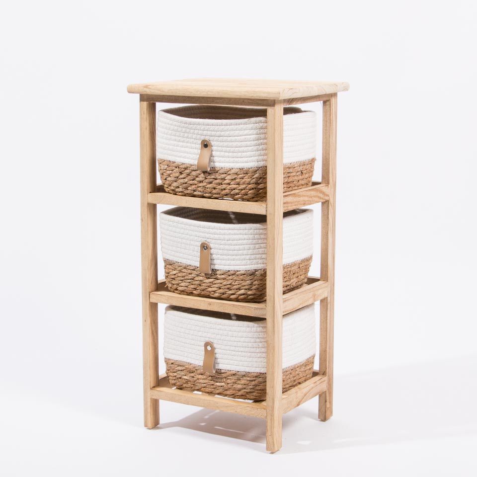 A estrutura é fabricada em madeira de Paulownia, conhecida como o "alumínio da madeira" pela sua incrível leveza e resistência, apresentando um acabamento natural que destaca os veios da madeira. Acompanha três cestos bicolores, meticulosamente tecidos em corda de algodão (off-white) e ervas marinhas (seagrass), criando um contraste de texturas que é tendência absoluta no design de interiores.